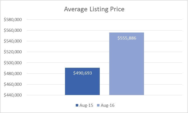The average listing price has increased from $490,693 in August 2015 to $555,886 in August 2016. This was caused by the decrease of Current Inventory numbers from 2015 to 2016.