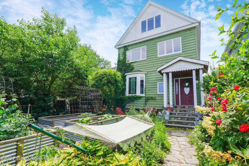 Front yard is a SECLUDED SANCTUARY boasting vintage slate patio, steps and walkways, fruit trees (4 apple, 1 peach), Raised vegetable beds, with tiered gardens below. Additionally, an eco-friendly honey bee colony produces on site, as well as a covered, open-air chicken run with hobby coops and nesting boxes. The organic FRESH EGGS, HONEY, FRUITS AND VEGETABLES make for a glorious, sustainable bounty. Buyer free to adopt the birds and bees or may request relocation. This sturdy Victorian-era (c.1885) side hall colonial is among six believed built by George Bechtel for his brew master and brewery managers. Only 2 miles from Staten Island Ferry
