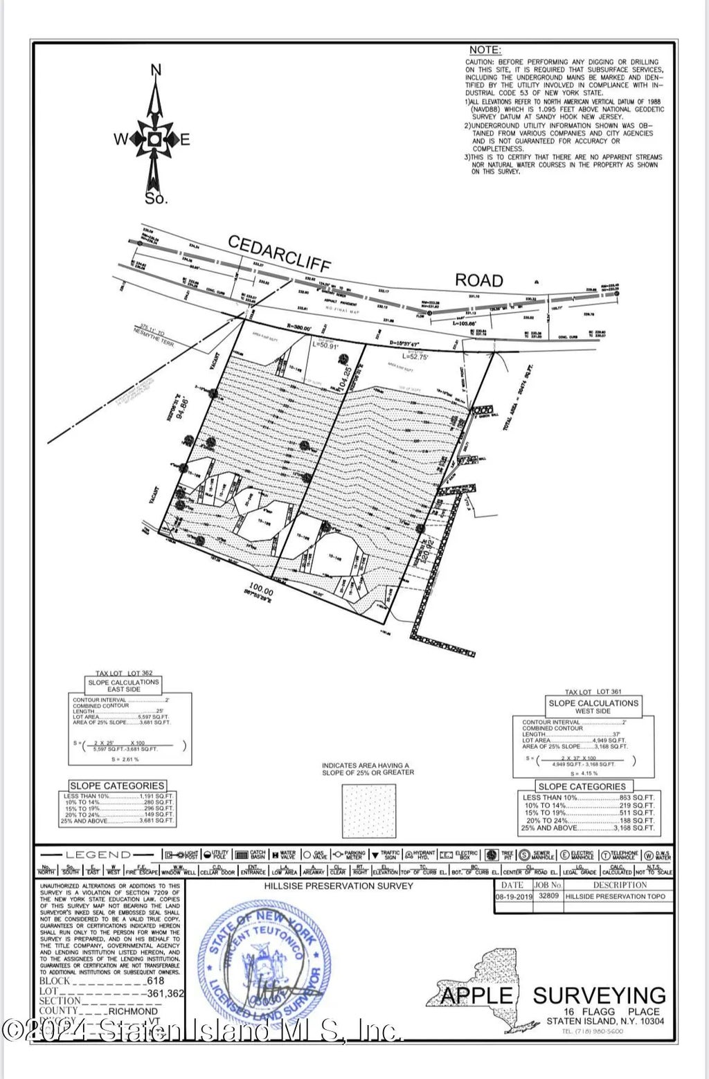 4949 square feet of raw land (must be sold with 40 Cedarcliff Road MLS# 2404665) for a total of 10,546 sq feet.. Lot is located on Cedarcliff Road, a quiet residential street with a beautiful view of the Verrazano Bridge, surrounded by million dollar homes. R-2 Special Hillside district. Potential to build a single family home (5,300 sq feet plus basement)or two single family homes (2500sq feet, plus basement). No representations, please consult your architect.
