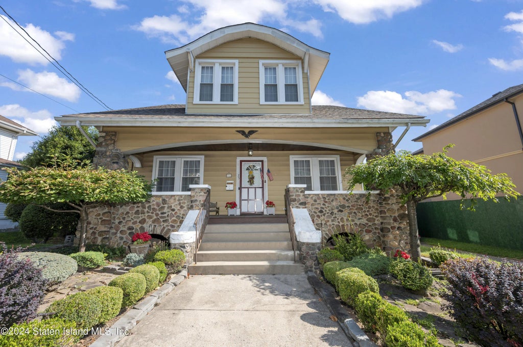 Welcome home to this 3 Bedroom/2 Bath Dutch Colonial with large, stone, open porch uniquely situated on an oversized lot. 75' frontage with one car detached garage and driveway. First floor consists of bright entry foyer, formal living room with sitting area/office and ornate crown cornice, formal dining room with wood beamed ceiling, wainscoting, original woodwork throughout, hardwood floors, kitchen, pantry, door to basement and yard. 2nd floor consists of foyer, full bath, master bedroom with built in window seat, large second bedroom, third bedroom. Lower level: full finished basement with bar, 3/4 bath, and utility room. R3X zoning permits 1 or 2 family detached homes enabling this colonial to be converted into a large two family. You can also expand the existing home or enjoy park like setting in rear yard. This yard can become your dream oasis. A must see! Easy access to transportation, VZ Bridge to Brooklyn, Manhattan, shopping, restaurants, parks, schools, and more.