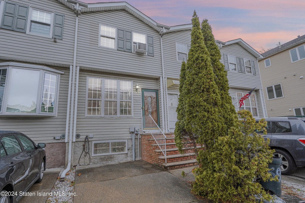 Beautiful young townhome located on a quiet dead end street minutes from the Verrazano Bridge. Features three bedrooms and two baths with full high ceiling basement. Soaring 9' ceilings and hardwood floors throughout. Eat in kitchen with 42'' cabinets for plenty of storage and sliders to yard. Maintenance free fence and off street parking. Level 1 - Living room dining room combo with half bath, entrance to basement and eat in kitchen. Level 2 - Three bedrooms with full bath and nice size closets. Basement consists of two large rooms, one being used as playroom and other for washer/dryer and utilities. minutes away from Brooklyn.