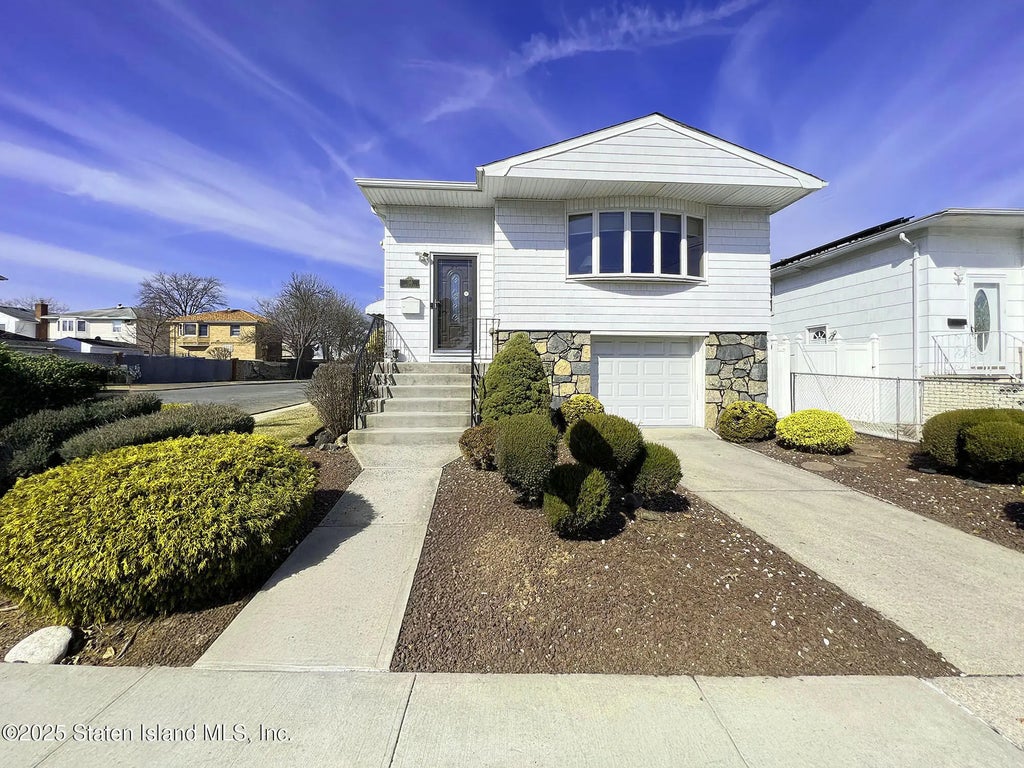 Welcome to this delightful 3-bedroom detached raised ranch centrally located in Staten Island's Heartland Village! Sitting proudly on a spacious corner lot, this home boasts abundant curb appeal and a low-maintenance yard with an above ground pool. The main level is bright and airy, offering a sun-drenched living room and an updated kitchen complete with stainless steel appliances. the master bedroom provides a private half bath, and hardwood floors flow seamlessly throughout the entire living space. Downstairs, the lower level gives you direct access to the yard and features a versatile area ideal for a family room, home gym, or office, plus a one-car garage.