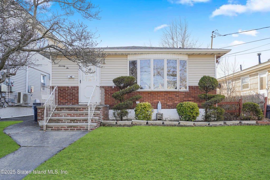 Location, Location, Location! Do not miss the opportunity to own this single-family detached ranch home on a quiet street in Great Kills. The 25'x42' house sits on a 40'x100' lot, offering a large front yard, a backyard, and endless possibilities: adding parking space and future expansion. The first floor features a living room and dining room, an eat-in kitchen, 3 generously sized bedrooms, 1 full bathroom, and a side entrance. Basement: Full basement with windows, 1 half bathroom, laundry room, and boiler and heating system area. 2-year-old roof with solar panels installed; Furnace for the heating system was replaced in 2018. Close to all: a few minutes' drive to Staten Island Mall, near Great Kills subway station, restaurants, Golf club, fitness center, parks, schools, and shopping. This property is being sold ''as is'' and needs TLC.