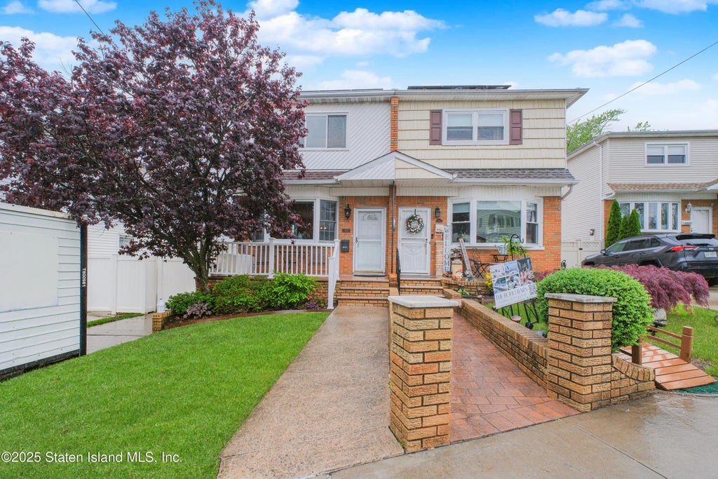 Welcome to this charming semi-attached home in the highly sought-after Willowbrook area of Staten Island. Its prime location ensures easy access to major highways, making commuting a breeze. As you enter, you'll find a spacious, open-concept living and dining area that leads into the kitchen and offers easy access to a private trex deck, perfect for enjoying the breathtaking views of the neighborhood. A convenient half bathroom completes the first floor. The second floor features three generously-sized bedrooms and full bathroom. The fully finished walk-out basement is a true addition, offering a bathroom and direct access to the backyard. Whether you're hosting family gatherings or looking for extra living space, this versatile lower level is perfect for a variety of uses. Adding to the home's appeal are solar panels, contributing to energy efficiency. With its convenient location, stunning views, and flexible living spaces, this home is a must-see!