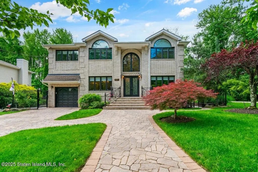 Welcome to this magnificently located, all brick, two unit center hall colonial with steel I-beam construction. The last house situated on a dead end street, this home is surrounded by serenity. You'll be greeted by powder coated aluminum, custom double front entry doors and transom. Level 1 welcomes you with a motorized crystal chandelier, continuous Brazilian Walnut/Ipe iron wood flooring. You'll find a formal living room and dining room, a living room with gas fireplace and an all-tile powder room. The kitchen is equipped with Sub-Zero and Wolf appliances, cherry wood cabinets, granite countertops and a beautiful Schonbek Renaissance chandelier above an oversized island with seating for six. Sliding doors open to a resort-like fully paved yard with saltwater, heated inground pool with brand new liner (liner installed October 2024) and a hot tub with new cover. Fully finished basement features a 3/4 bathroom, large storage closets and new tile floor. Wrought iron railings lead upstairs to level 2 where you'll find three bedrooms and a full bathroom with heated spa tub. Master bedroom with electric fireplace has been extended into apartment. 2nd floor apartment can be used as a studio apartment or a one bedroom with living room. Home is currently being used as a one unit home but is easily converted. Apartment also features a full bathroom, kitchen with new refrigerator and side entrance. This home has Hunter Douglas shades and custom window treatments throughout. New roof with 10.5 KW Solar Panels installed in 2016, 20 KW whole house generator, front pavers are radiant heat/ice ready, whole house central vacuum system, new spray foam insulation in attic, lawn sprinkler system, surveillance security camera system, newly painted exterior trim. The location of this South Shore home is unparalleled, minutes from the Outerbridge Crossing, Expressway, and Parkway, one block to express bus to Manhattan and several more to SIRR, as well as many stores.